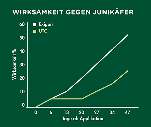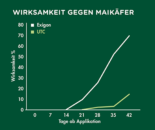 EXIGON® wird im Frühjahr und/oder Herbst ausgebracht. Für Maikäfer liegt die Schadschwelle bei 30 Larven/m², für Junikäfer bei 60 Larven/m² und für Gartenlaubkäfer bei 100 Larven/m². Je kürzer die Larven im Boden verweilen, desto höher wird die Schadschwelle gesetzt (Maikäfer 3-4 Jahre, Junikäfer 2 Jahre, Gartenlaubkäfer 1 Jahr). Im Frühjahr sollten in regelmäßigen Abständen Probegrabungen zur Befallserhebung durchgeführt werden, dabei muss die Anzahl sowie die Art der Larven bestimmt werden.