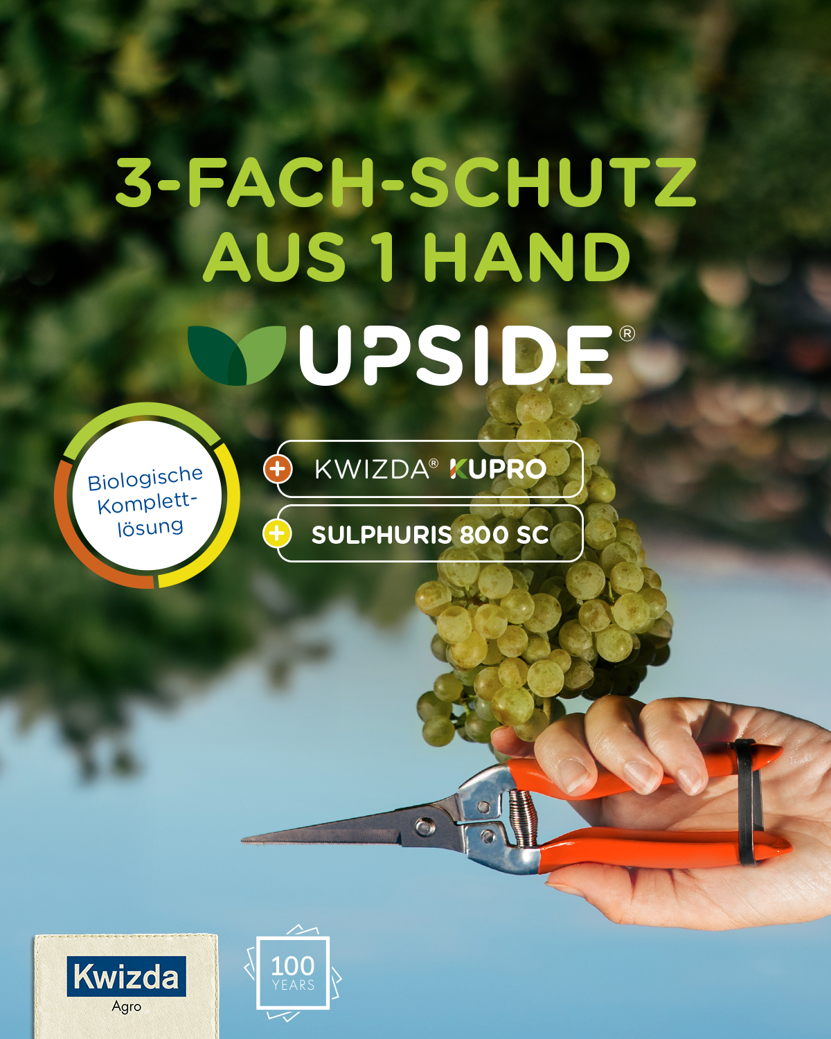 Die UPSIDE® Kombi ist die biologische Komplettlösung für einen ganzheitlichen Pflanzenschutz im Weinbau. Mit UPSIDE®, KWIZDA® KUPRO und SULPHURIS® 800 SC vereint Kwizda Agro drei bewährte Produkte zu einem optimal abgestimmten 3‑Fach‑Schutz aus 1 Hand.